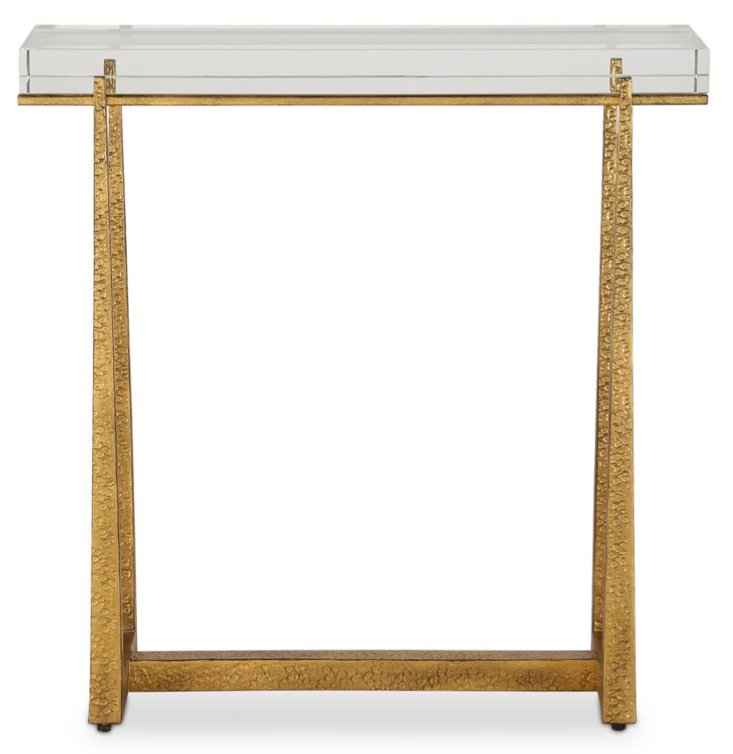 This elegant accent table adds a touch of luxury to any room. The textured antique gold finished iron legs perfectly support and accentuate the thick crystal top.