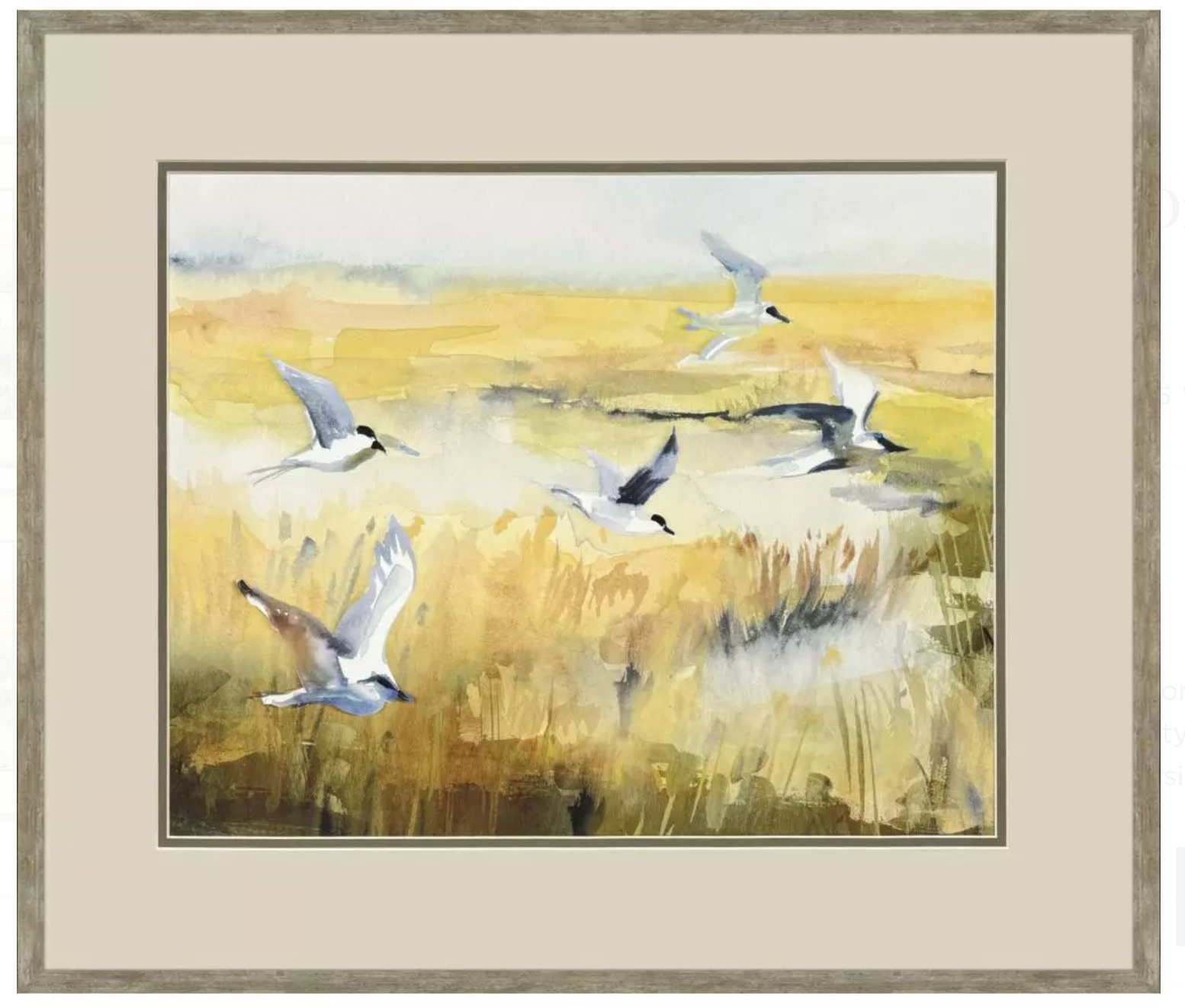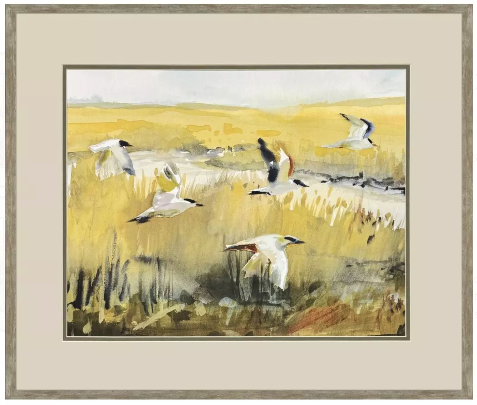Seabirds perform an aerial dance above the marsh. Matted in putty and framed in a flat profile wood in an antique silver finish with dark highlights.