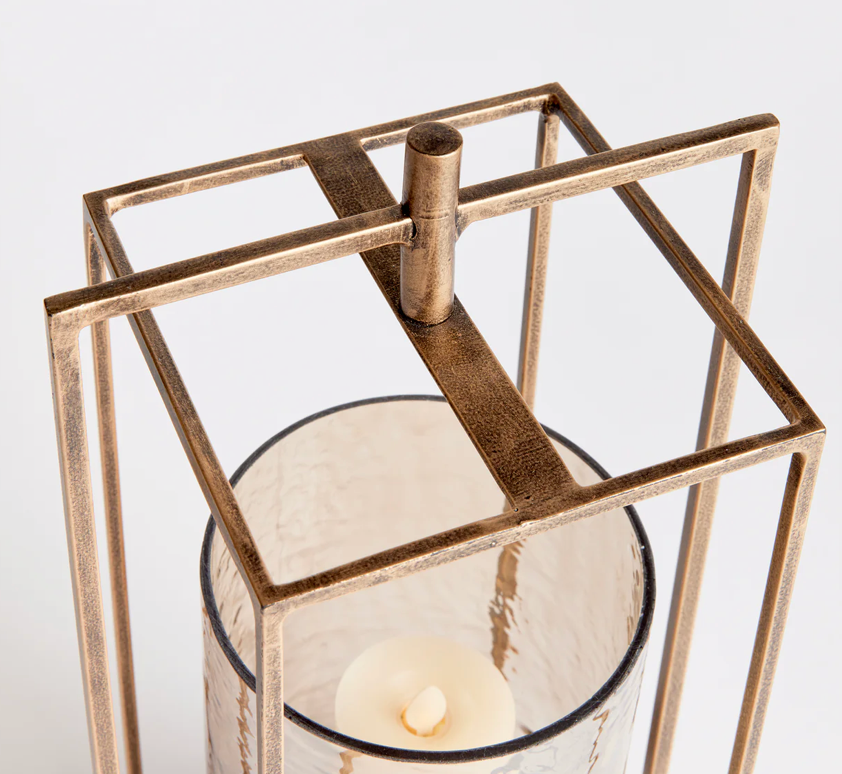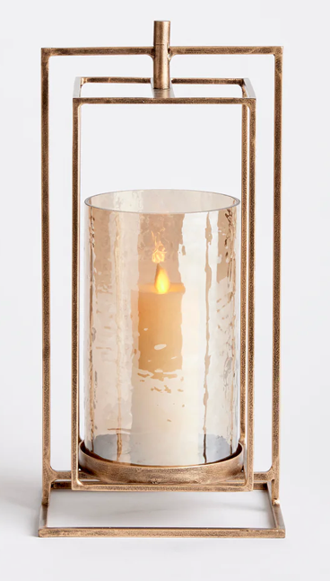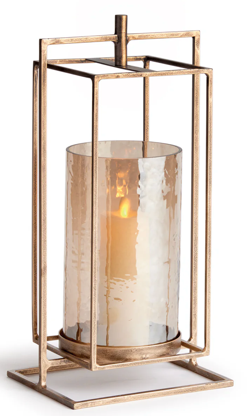 With a warm antique gold finish, elevated design and hammered lustre glass hurricanes, this candleholder is a work of art. Perfect for side table, entryway console or mantel.